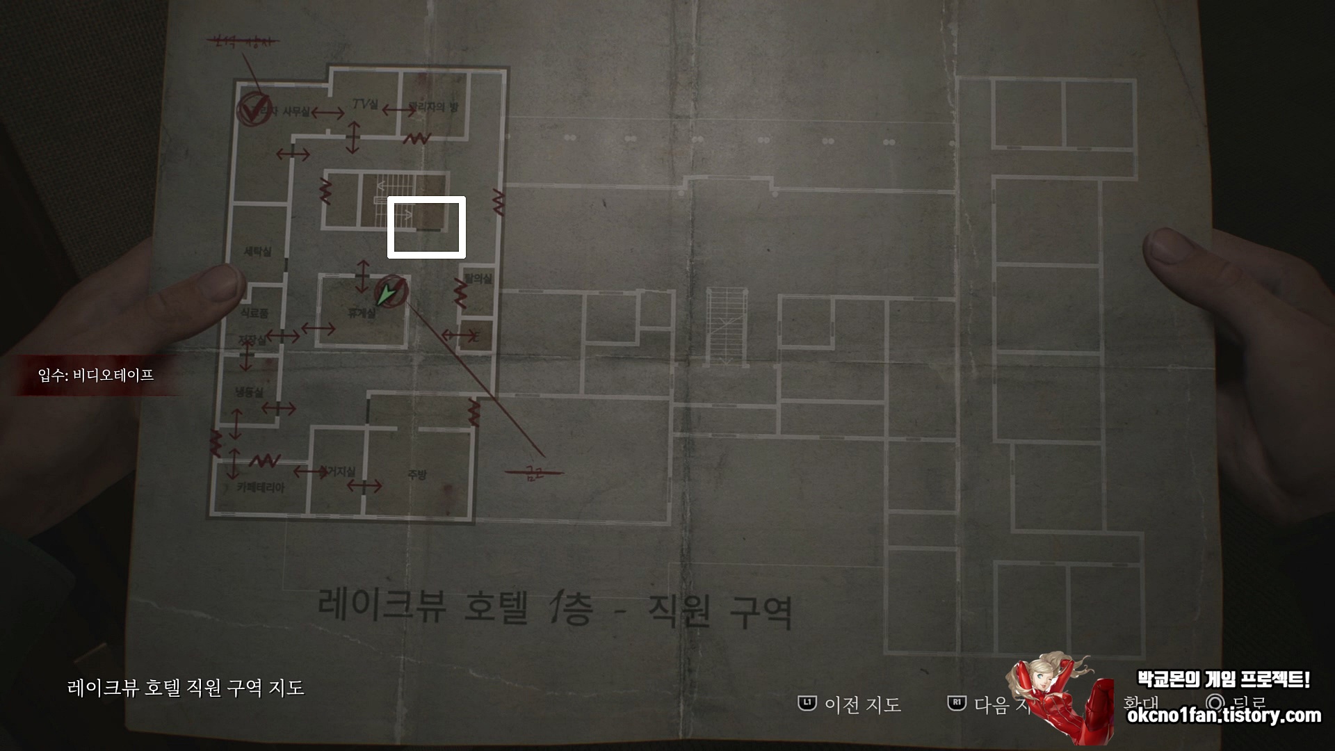 | 1 | ![]() 직원 구역의 휴게실 게시판에서 레이크뷰 호텔 직원 구역 지도와 레이크뷰 호텔 지하실 지도를 입수합니다. |