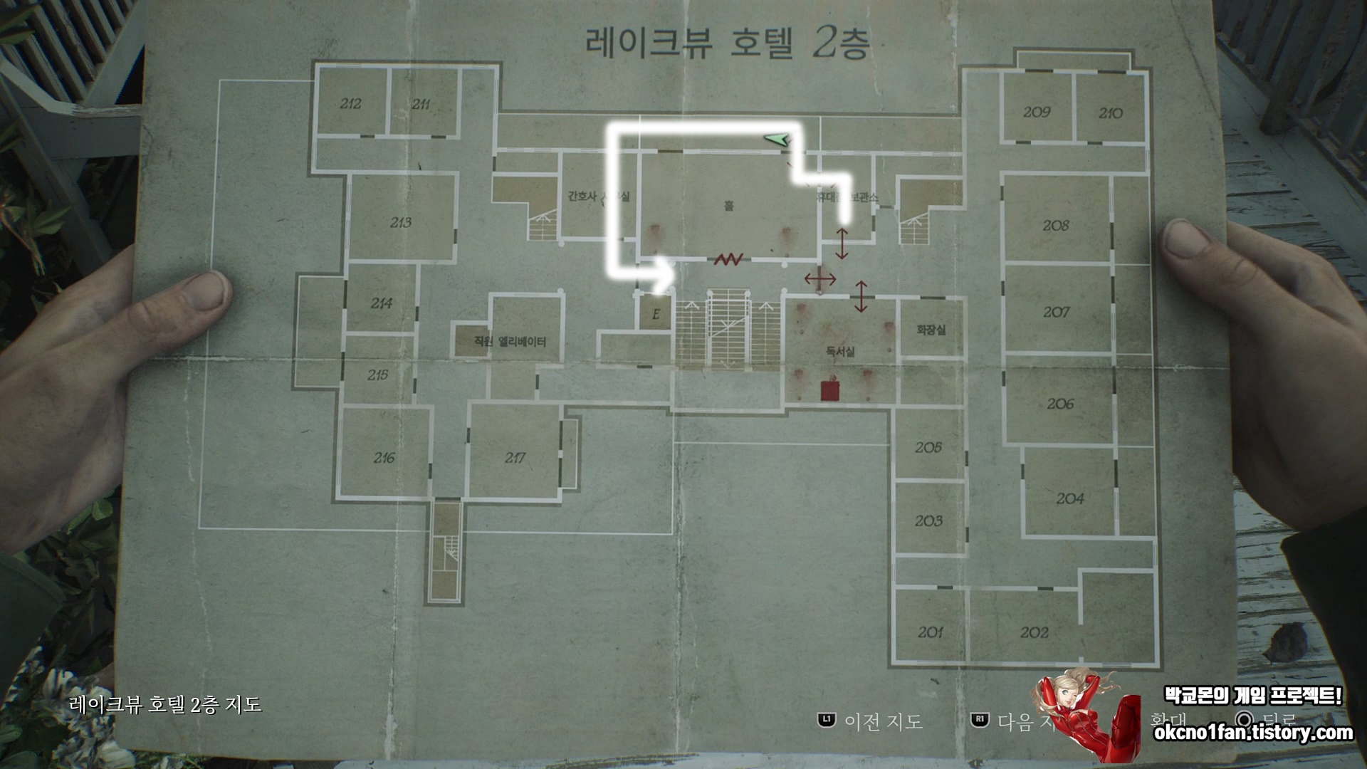 | 17 | ![]() 3층으로 이동해 3층 복도 열쇠를 사용해 동쪽 구역으로 진입한 뒤, 312호실로 이동합니다. |