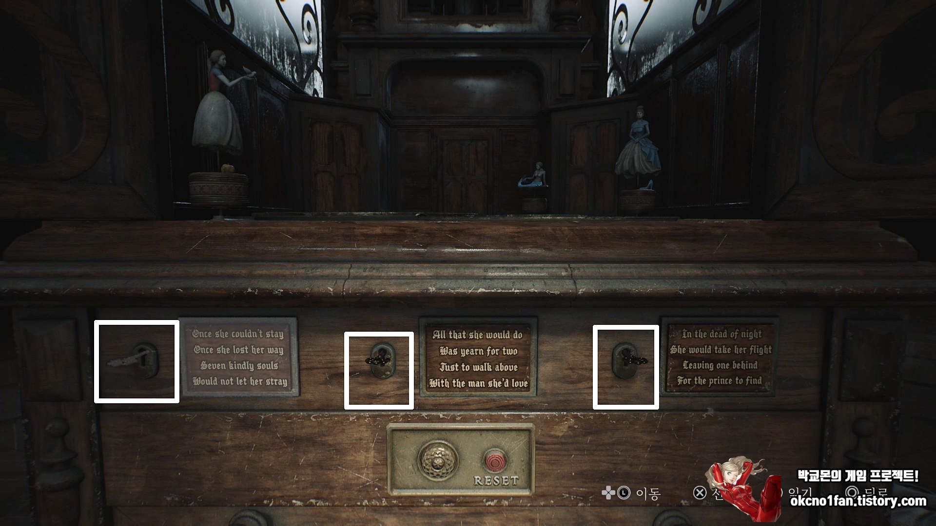 | 15 | ![]() 1층 중앙의 오르골에 3개의 조각 백설공주 조각, 신데렐라 조각, 인어공주 조각을 배치합니다. 회전판을 조정해 조각들이 문에 들어갈 수 있는 길을 만들고, 오른쪽 아래의 버튼을 누릅니다. |